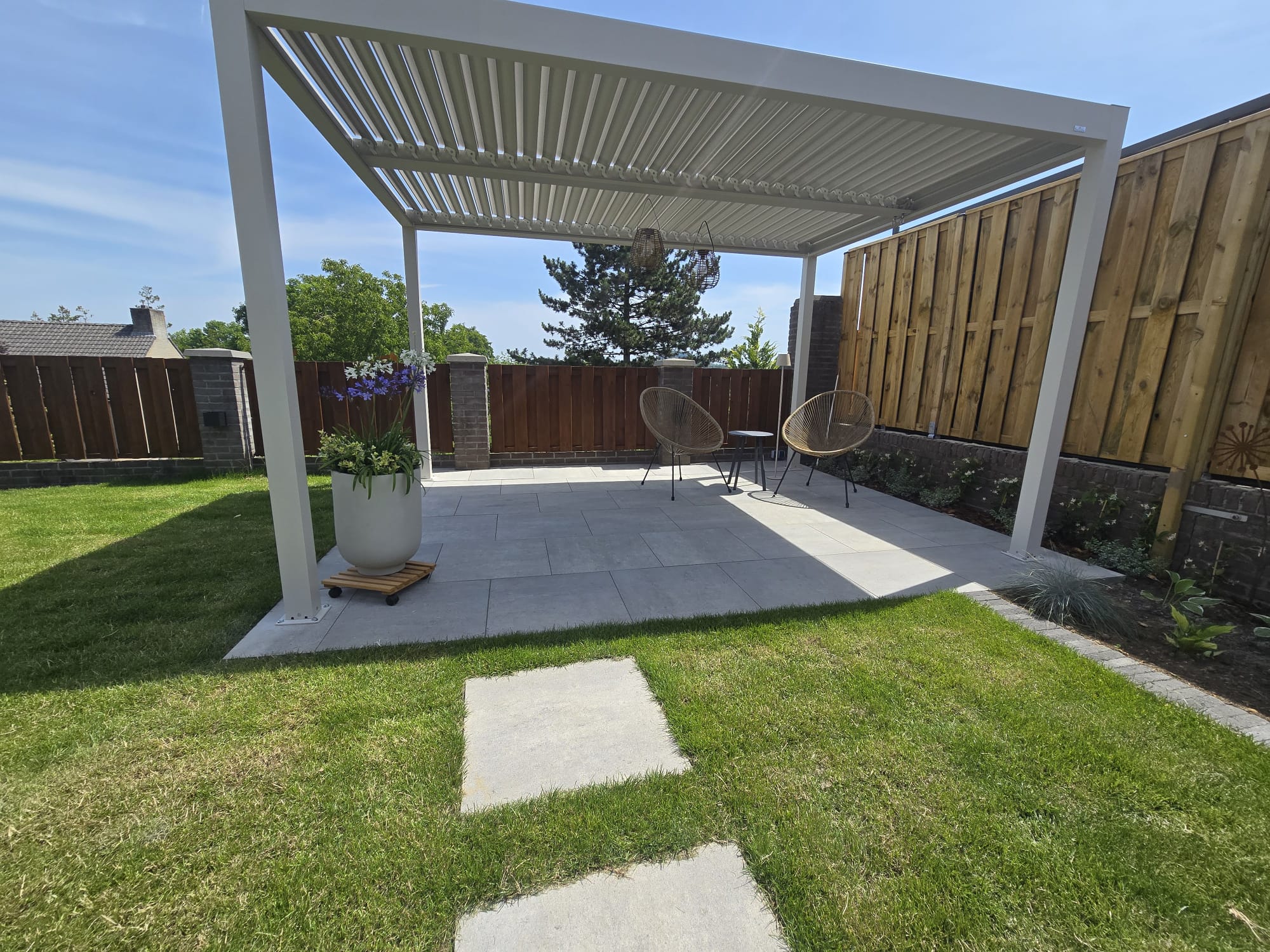 Modern terras met lamellendak en gazon